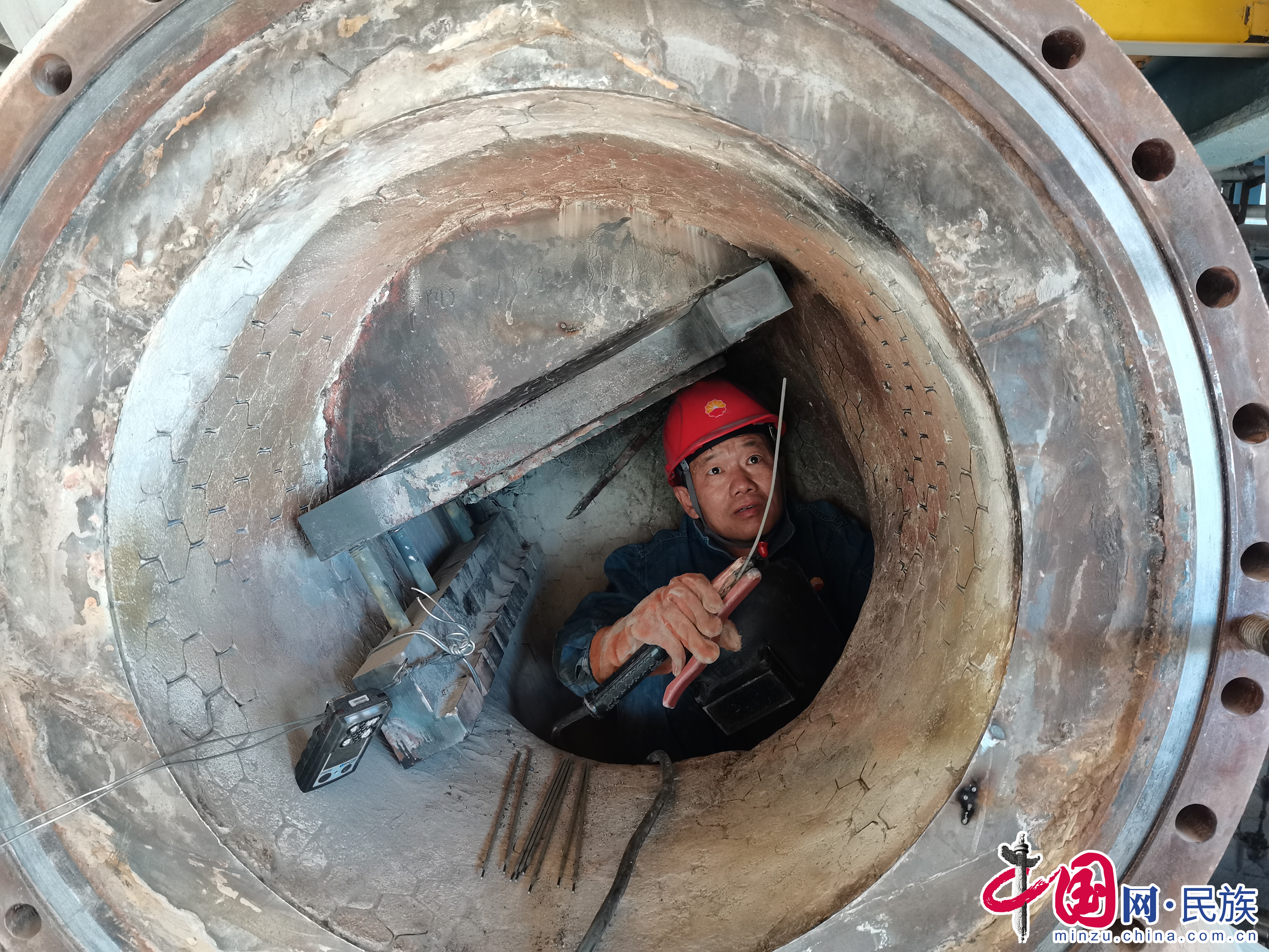 “作業(yè)空間狹窄深邃,上下需攀爬近十八米軟梯,沒(méi)有腳手架,只能站在軟梯上操作,還彌漫著大量催化劑。冬天作業(yè)時(shí),身前是電弧高溫,后背是冰冷塔壁?!睏钣览谡f(shuō),每次完工全身烏黑,防塵口罩糊滿(mǎn)泥巴,四肢酸困,眼睛紅腫,聲音沙啞,咳嗽發(fā)燒更是常事。