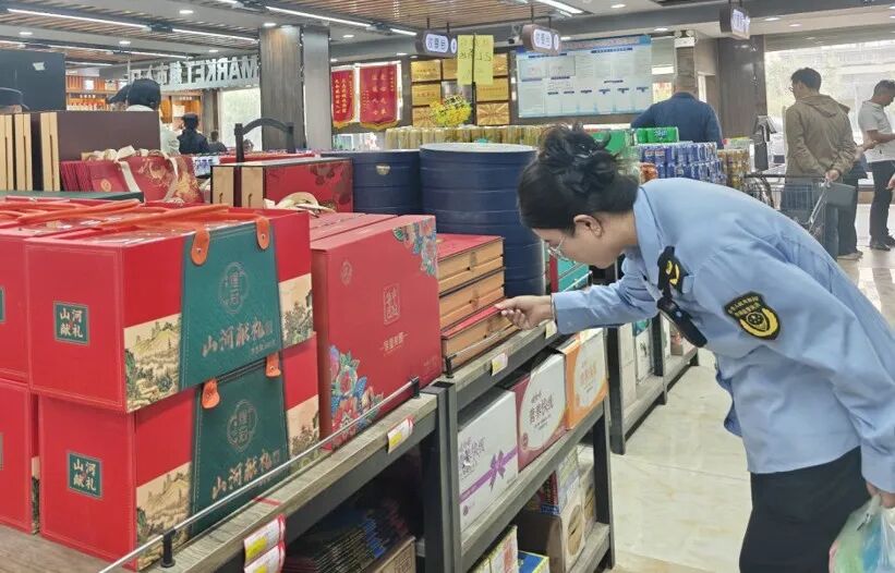 檢查組兵分多路,深入大型商超、肉類專賣店、水果超市等重點場所,圍繞“米袋子”“菜籃子”開展全鏈條排查:逐一核驗米面糧油、肉蛋奶、蔬菜水果等生活必需品的進貨渠道、庫存數(shù)量、保質(zhì)期及產(chǎn)品質(zhì)量,確保源頭可溯、質(zhì)量可靠。針對月餅市場,嚴格對照國家標準,重點抽查包裝層數(shù)、材質(zhì)環(huán)保性、體積合理性及售價,現(xiàn)場糾正“豪華包裝+高價搭售”行為,向經(jīng)營者發(fā)放《綠色包裝倡議書》,倡導簡約包裝、拒絕“天價月餅”,讓月餅回歸傳統(tǒng)本味。